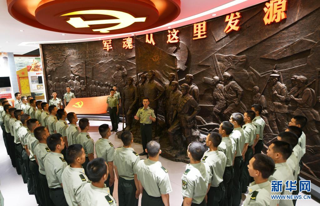 在陸軍第83集團軍某旅“紅一連”連史館“軍魂從這里發源”雕塑前,指導員鄭紀文(中)為官兵講述“支部建在連上”的光榮歷史(7月4日攝)。新華社記者 張永進 攝