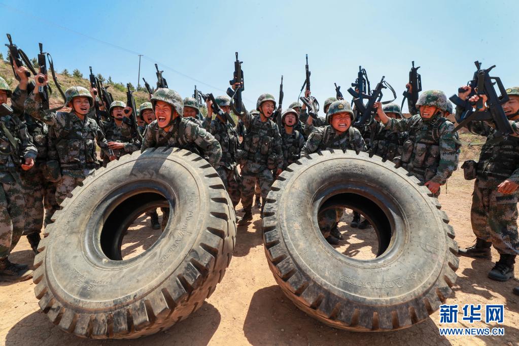 陸軍第83集團軍某旅“紅一連”官兵在訓練間隙開展翻輪胎比賽(2020年5月1日攝)。新華社發(姜東坡 攝)
