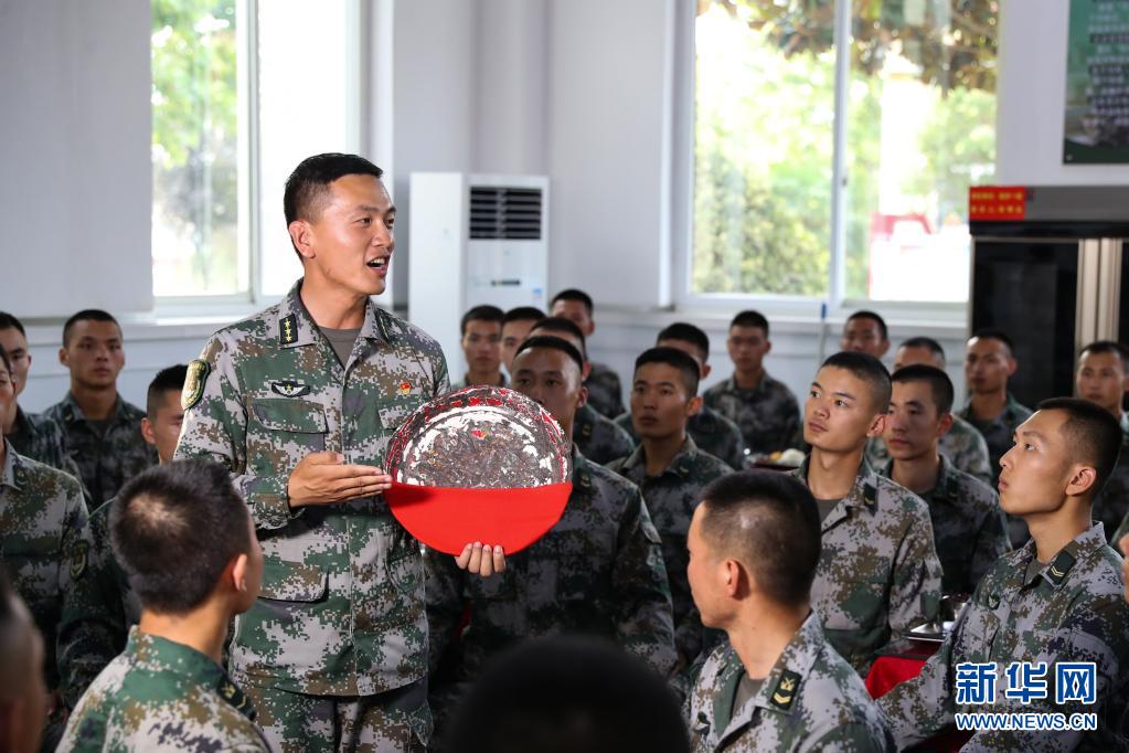 黨史學習教育中,陸軍第83集團軍某旅“紅一連”指導員鄭紀文為官兵講述連隊傳家寶“紅菜盤”背后的故事(6月13日攝)。新華社發(姜東坡 攝)