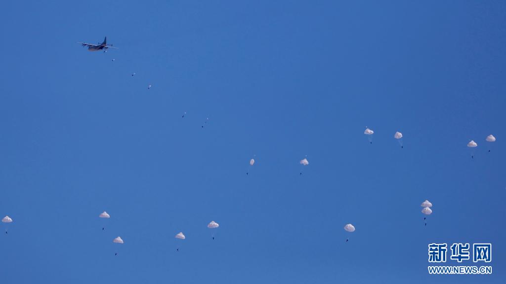 在“西部·聯合-2021”演習第一次實兵實裝實彈合練中,運-9飛機搭載空降兵進入“敵”縱深地域上空實施集群傘降(8月5日攝)。新華社記者 劉芳 攝