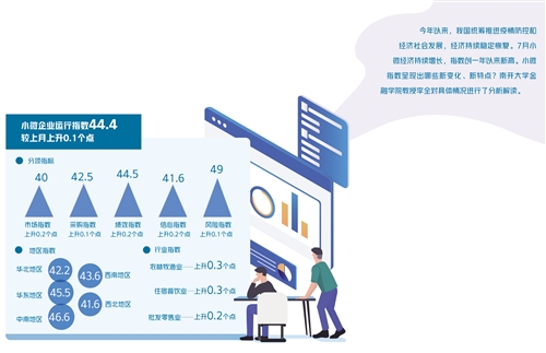 7月份,“經(jīng)濟日報-中國郵政儲蓄銀行小微企業(yè)運行指數(shù)”為44.4,較上月上升0.1個點。分項指數(shù)呈現(xiàn)“五升三平”態(tài)勢。其中市場指數(shù)為40,上升0.2個點;采購指數(shù)為42.5,上升0.1個點;績效指數(shù)為44.5,上升0.2個點;擴張指數(shù)為42.6,與上月持平;信心指數(shù)為41.6,上升0.2個點;融資指數(shù)為52.9,與上月持平;風險指數(shù)為49,上升0.1個點;成本指數(shù)為63,與上月持平。自2020年7月以來,小微企業(yè)運行指數(shù)穩(wěn)中有升。