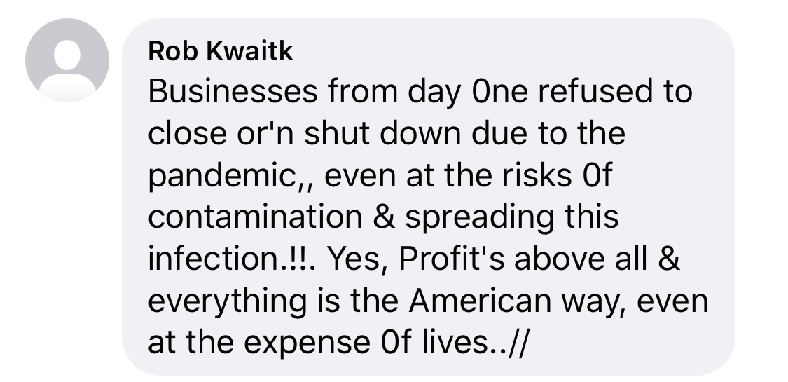 網友Rob Kwaitk留言:“商家們從第一天開始就拒絕因為疫情而關門,哪怕冒著疫情擴散的風險!沒錯,利益至上才是美國方式,哪怕付出生命的代價也在所不惜。”
