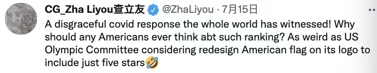 網友Zha Liyou留言:“讓全世界見證了如此丟人的疫情應對方式!為什么美國人竟然會想出這樣的排名來?”