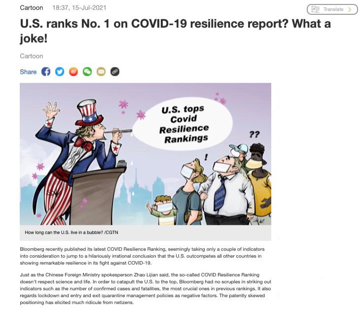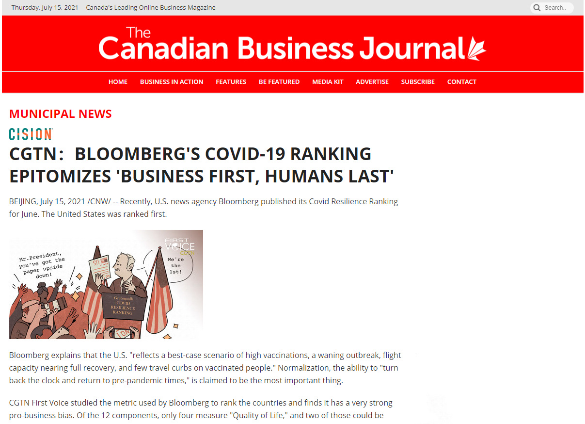 日前,美國彭博社更新了所謂“抗疫韌性排行榜”,美國位列第一、中國排在第八,排行榜還指出中國抗疫存在若干所謂“缺點”。CGTN就此作出回應,發布了《彭博社的全球抗疫排名體現了“商業第一,人民倒數第一”》一文,揭露彭博社“排行榜”的真相。