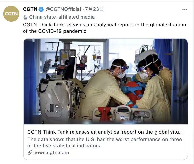 7月23日,CGTN智庫面向全球發布《國際新冠疫情發展現狀分析報告》。報告指出,在防疫中表現的“累計確診數量”、“新增確診人數”、“累計死亡人數”、“疫苗接種數”、“疫情整體控制周期”等五個統計維度中,美國有三項指標在全球各國中表現最差。CGTN特別報道《新冠疫情呈兩極化發展趨勢 美國防疫表現最差——CGTN智庫發布〈國際新冠疫情發展現狀分析報告〉》獲得美國、英國、加拿大、德國、法國、意大利、南非等28個國家和地區的378家海外主流網絡媒體轉載,觸達海外受眾超1.8億人次。落地媒體中,G20國家媒體數335個,占比88.6%。