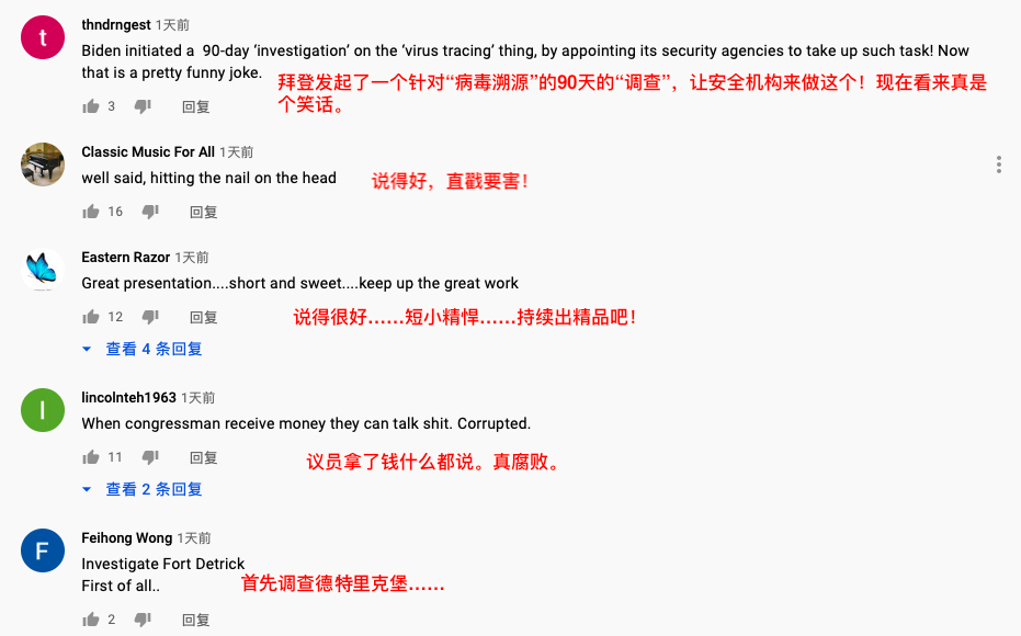 在西方媒體占主導的海外社交媒體平臺,能夠取得關注和支持并不容易。但是這一揭露美政客對于新冠溯源陰謀的系列視頻擺事實、講證據(jù)、有邏輯、有新意,讓謠言不攻自破,自然能獲得更多人的贊同。就跟網(wǎng)友點評的一樣:“直戳要害!”