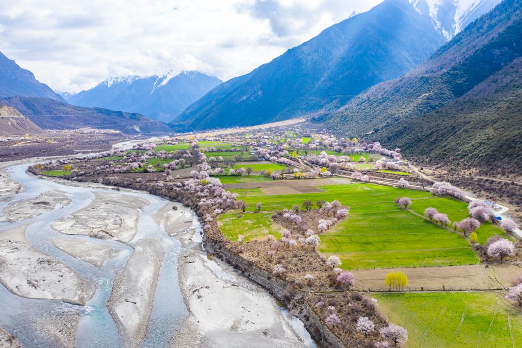 西藏林芝市波密縣境內桃花盛開的田園風光(2020年3月26日攝,無人機照片)。新華社記者普布扎西 攝