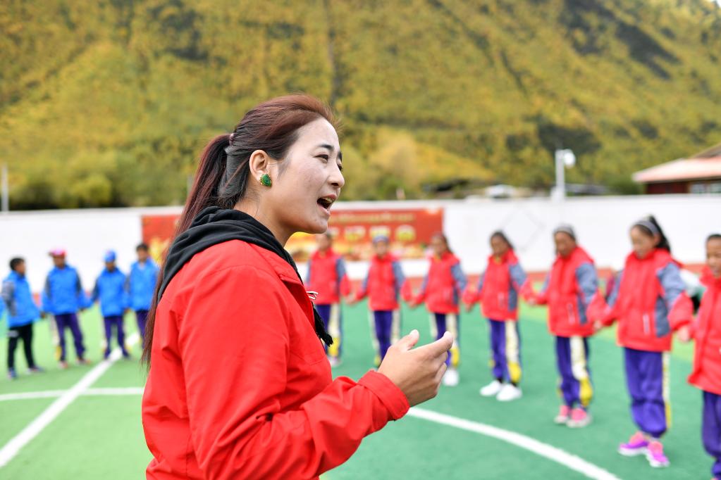 在西藏林芝市波密縣多吉鄉(xiāng)中心小學,央宗給學生們傳授“波央”的發(fā)音技巧(2020年10月13日攝)。新華社記者詹彥 攝