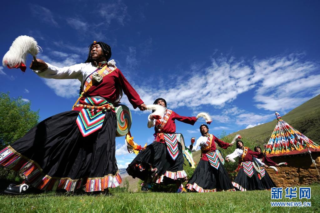 在山南市瓊結(jié)縣,久河村卓舞隊(duì)的隊(duì)員在表演國(guó)家級(jí)非遺項(xiàng)目“久河卓舞”(2020年7月1日攝)。新華社記者 詹彥 攝