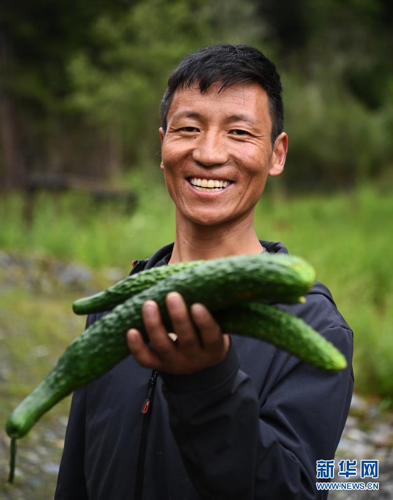 西藏山南市隆子縣玉麥鄉(xiāng)村民展示大棚里采摘的黃瓜,這些黃瓜將通過(guò)合作社銷往各地(2020年7月30日攝)。新華社記者 普布扎西 攝