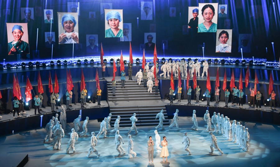 2021年6月26日,在武漢舉行的湖北省慶祝中國共產黨成立100周年文藝晚會上再現抗疫英雄群像。