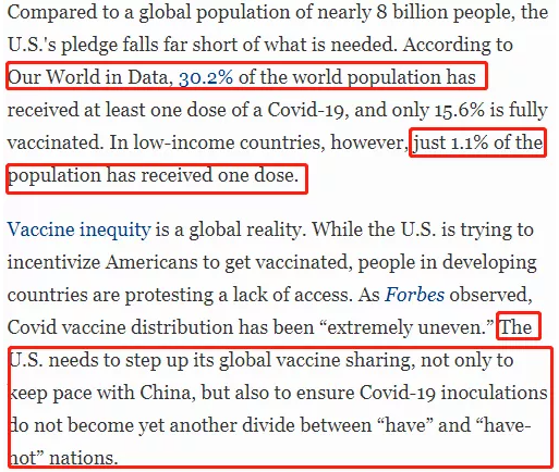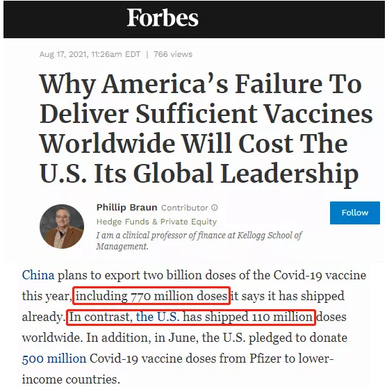 △《福布斯》文章截圖。文章說:中國已經提供7.7億劑疫苗(我官方最新數據顯示實際已發貨約8億劑)。相比之下,美國只向全世界運送了1.1億劑疫苗。