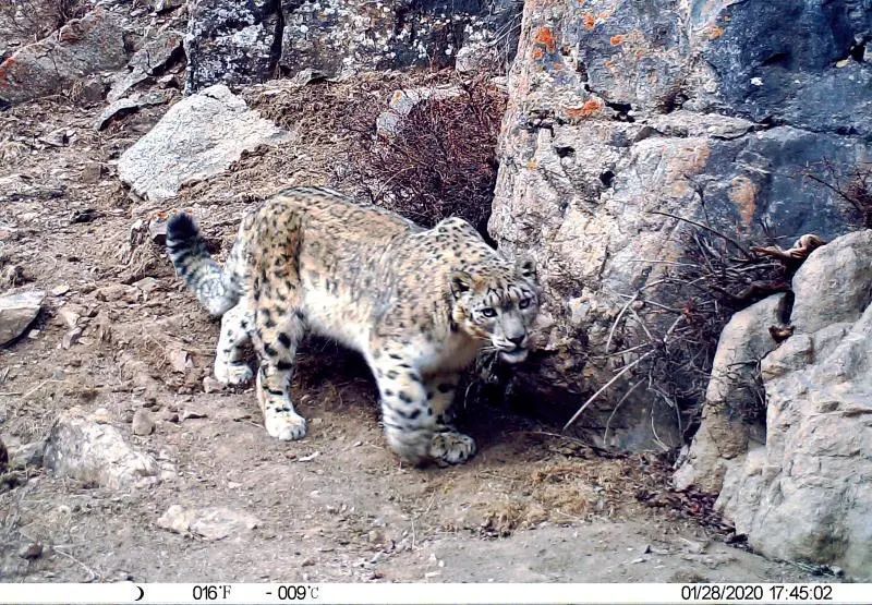 ▲ 布設在甘肅祁連山國家級自然保護區內的紅外相機于2020年1月28日拍攝的雪豹活動影像 大熊貓祁連山國家公園甘肅省管理局張掖分局供圖