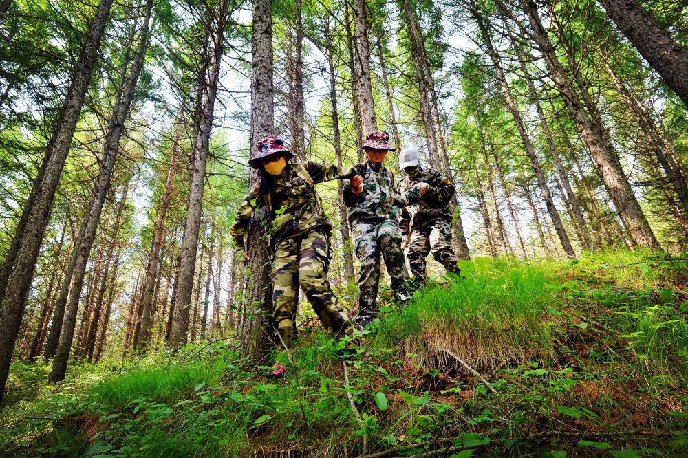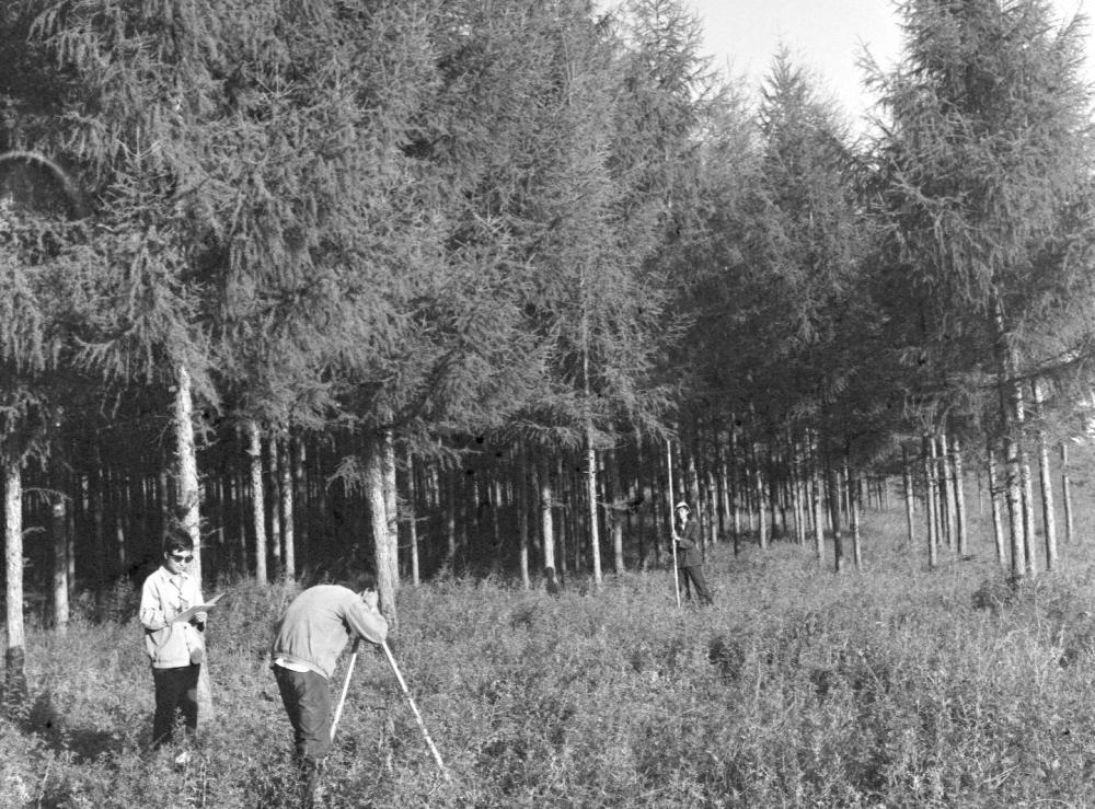 ↑林業調查隊員在塞罕壩林場進行森林調查(20世紀80年代資料照片)。
