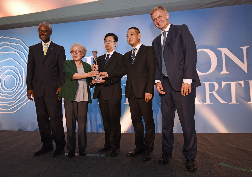 ↑在肯尼亞內羅畢聯合國環境規劃署總部,老、中、青三位塞罕壩人陳彥嫻(左二)、劉海瑩(中)、于士濤(右二)領取2017年聯合國環保最高榮譽——“地球衛士獎”(2017年12月5日攝)。