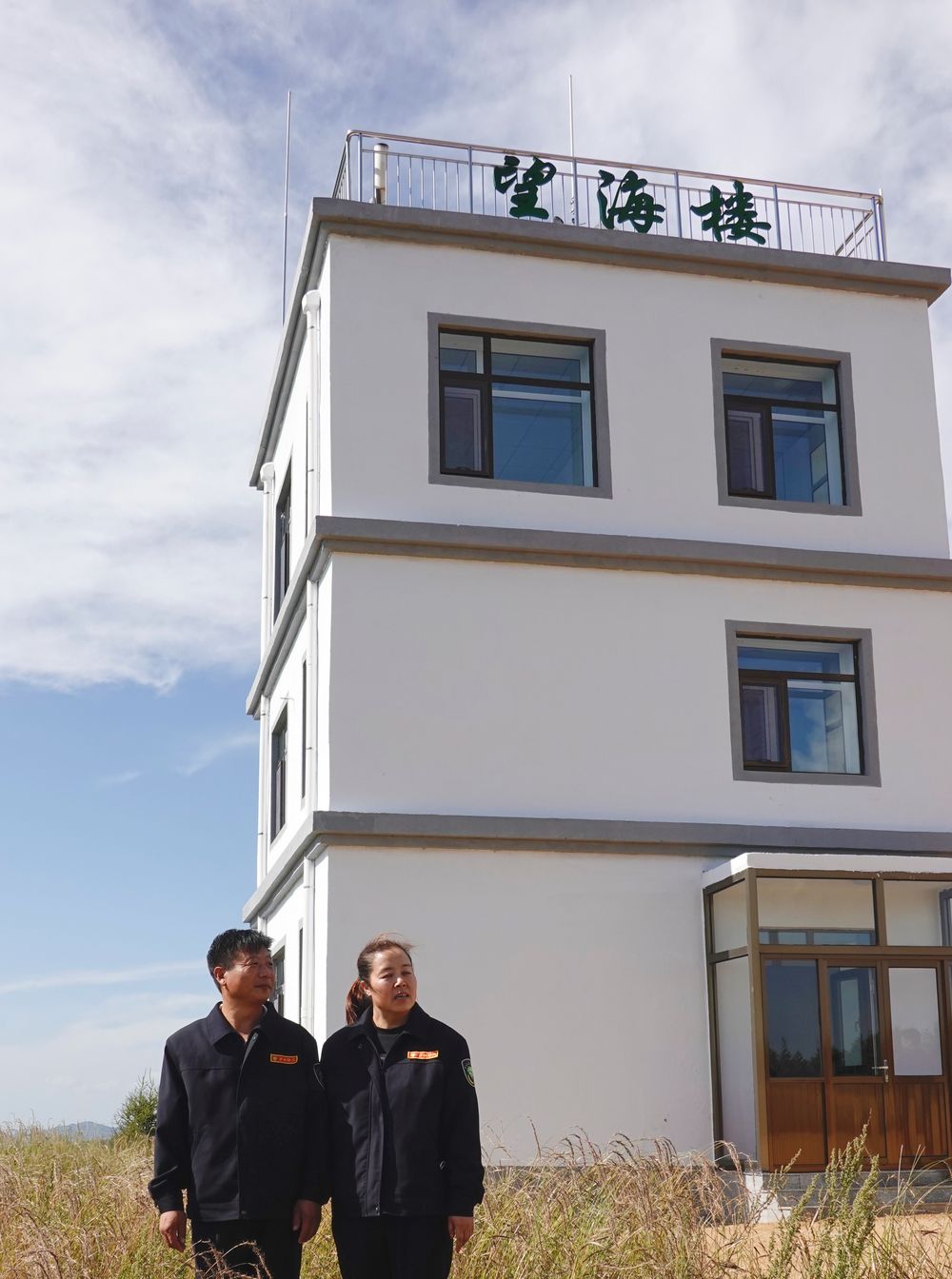 ↑護林員劉軍(左)、王娟在塞罕壩機械林場望海樓前(2021年8月23日攝)。在13年的堅守中,劉軍、王娟夫婦用常人難以想象的辛勤付出守護林場安全。