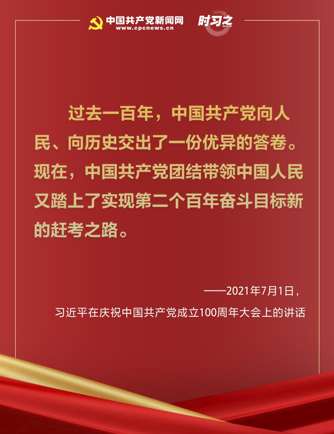 2021年7月,建黨百年的輝煌時刻,習近平總書記在慶祝中國共產黨成立100周年大會上莊嚴宣告,“現在,中國共產黨團結帶領中國人民又踏上了實現第二個百年奮斗目標新的趕考之路。”