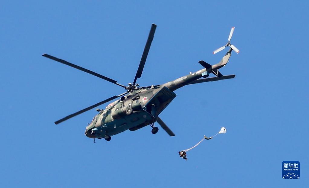 8月23日,參加“空降排”空降兵分隊(duì)比賽的中國(guó)參賽隊(duì)隊(duì)員在俄羅斯梁贊州跳傘。新華社發(fā)(方超 攝)