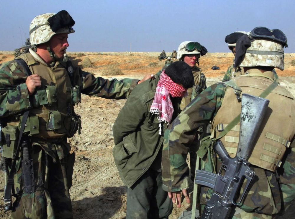 2003年4月1日,美國海軍陸戰隊士兵在伊拉克南部的迪瓦尼耶附近押解一名被蒙上雙眼的伊拉克戰俘。(新華社發,法切利攝)