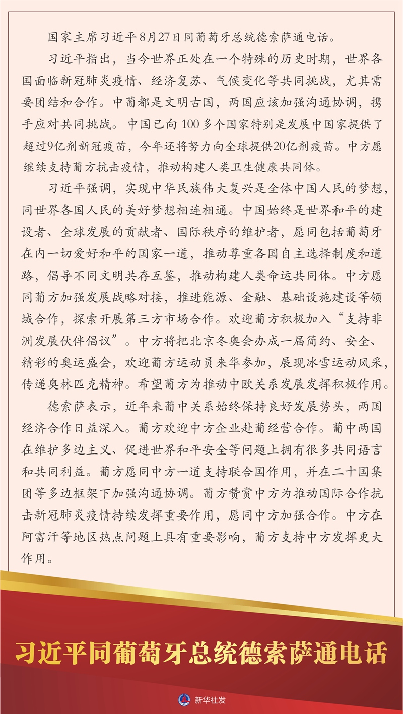 新華社北京8月27日電 國家主席習近平8月27日同葡萄牙總統德索薩通電話。