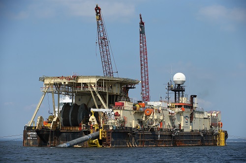 △當地時間2018年8月16日,德國盧布明附近的波羅的海,管道船在海里鋪設“北溪-2”天然氣管道。