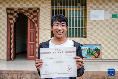 寧蒗寧海民族中學第三屆“海安班”學生蘇文杰展示不久前收到的復旦大學錄取通知書(8月25日攝)。新華社記者 胡超 攝