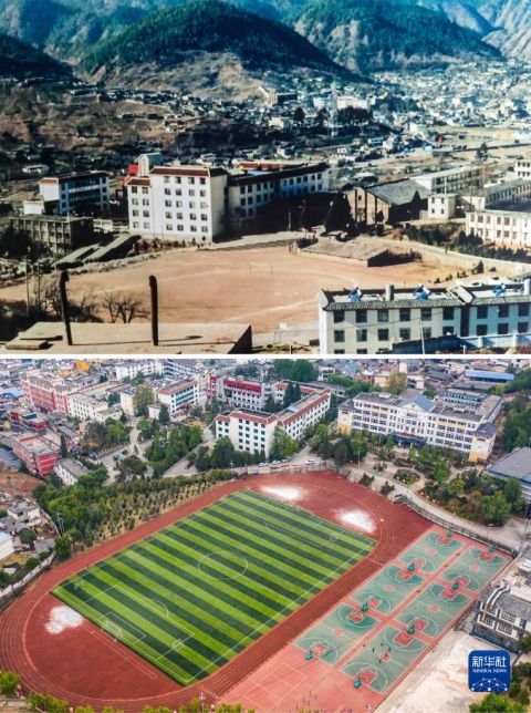 拼版照片,上圖為:20世紀90年代的寧蒗寧海民族中學一景(資料照片);下圖為:2021年4月16日拍攝的寧蒗寧海民族中學一景(無人機照片,新華社記者胡超攝)新華社發