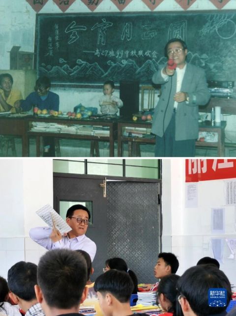 拼版照片,上圖為:海安老師王霖伯在寧蒗寧海民族中學高27班教室過中秋節(資料照片,1999年9月攝);下圖為:海安老師王霖伯在寧蒗二中高103教室上課(2021年4月23日攝,新華社發)新華社發