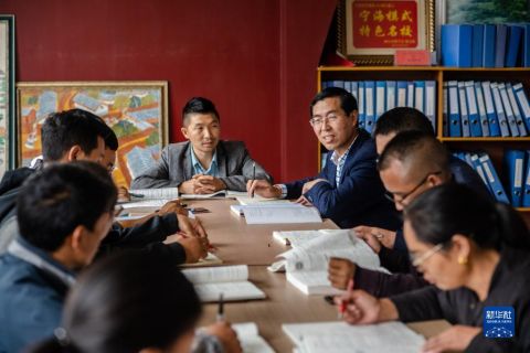 在寧蒗寧海民族中學,海安老師王擁軍(右四)作為化學備課組組長和同事一起備課(8月26日攝)。新華社記者 胡超 攝