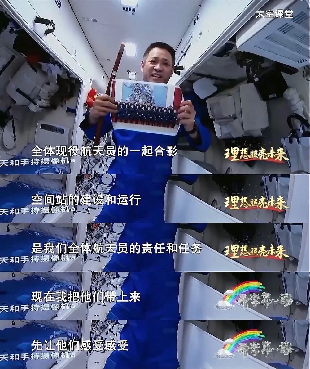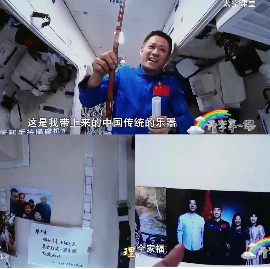 除此之外,三位航天員還向孩子們展示了跟隨他們一起進入太空的其他物件。例如,聶海勝的笛子、劉伯明的全家福、湯洪波的全家福以及妻子的手寫卡片。