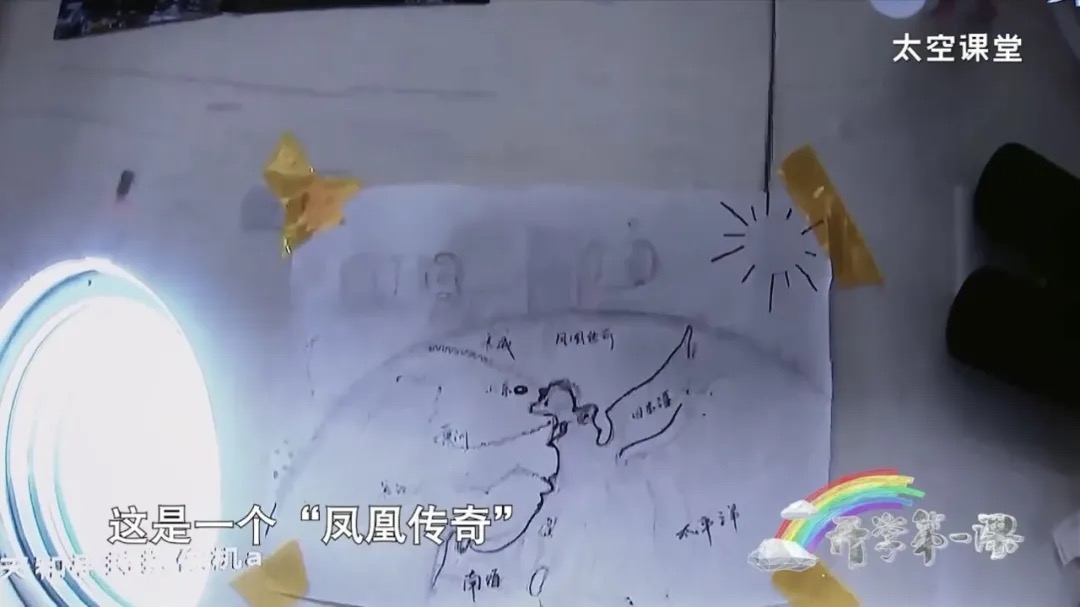 與全家福一同掛在劉伯明床頭的,是他在出艙后,在機械臂上看到祖國的渤海灣,即興創(chuàng)作的一幅作品。畫中的空間站、渤海灣、長江和黃河,像一只正在展翅騰飛的鳳凰,劉伯明將其命名為“鳳凰傳奇”。