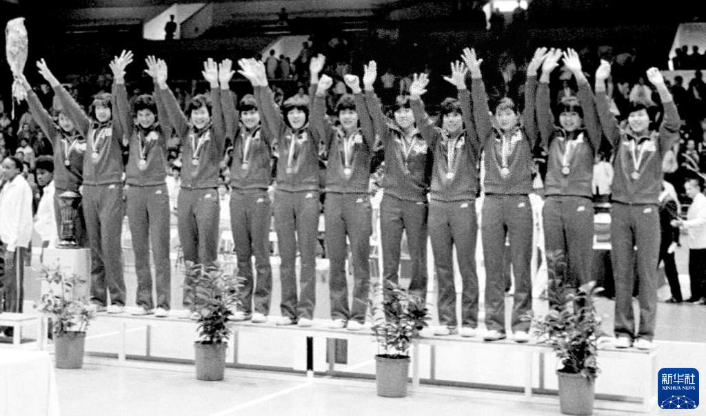 1982年9月25日,中國女排隊(duì)員在第九屆女排世錦賽頒獎(jiǎng)儀式上向觀眾致意。新華社發(fā)