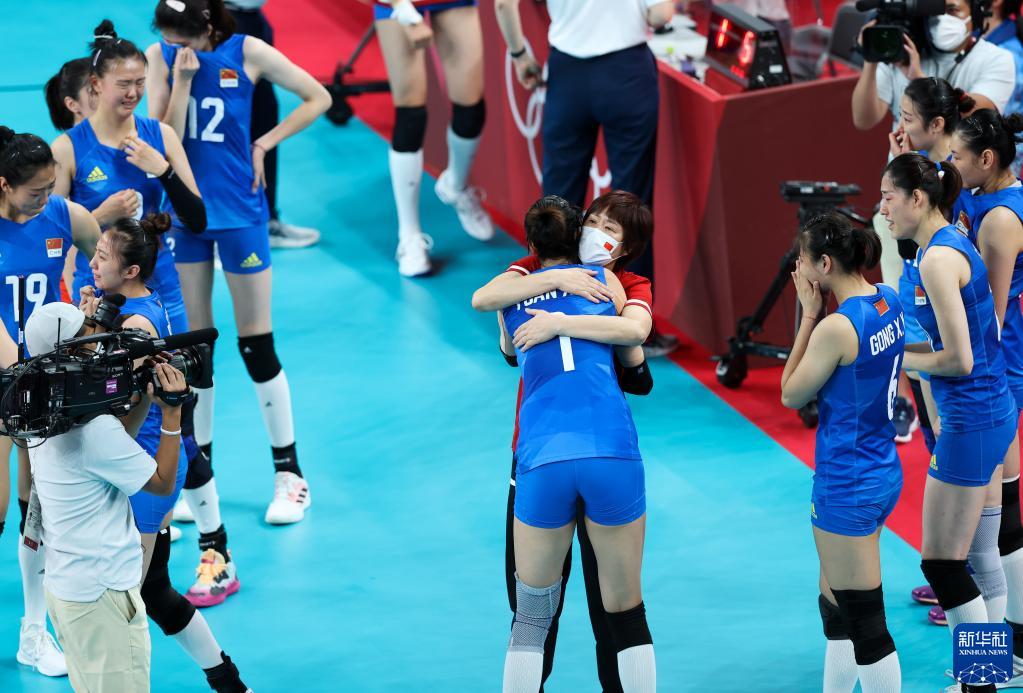 2021年8月2日,中國隊(duì)主教練郎平在比賽后與隊(duì)員一一擁抱。當(dāng)日,在東京奧運(yùn)會(huì)排球項(xiàng)目女排小組賽中,中國隊(duì)以3比0戰(zhàn)勝阿根廷隊(duì)。新華社記者 丁汀 攝