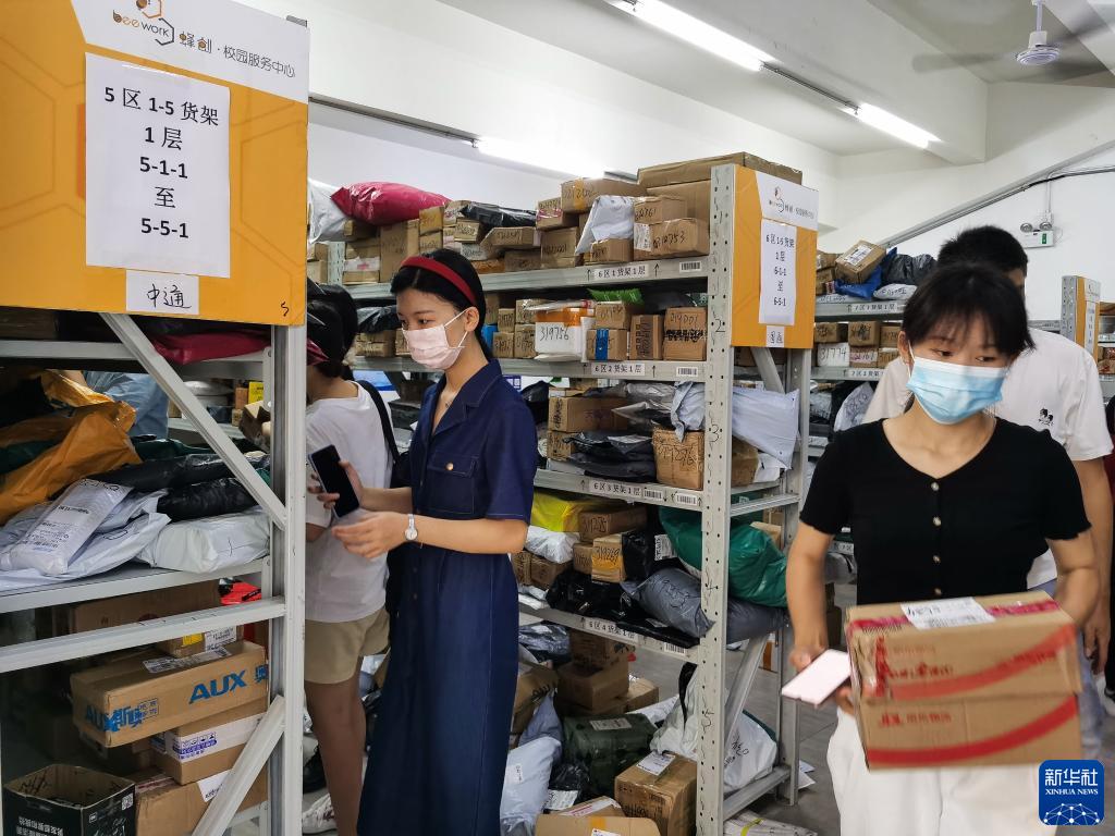 9月4日,入學新生在華南理工大學廣州國際校區宿舍樓快遞包裹庫房查找快遞。