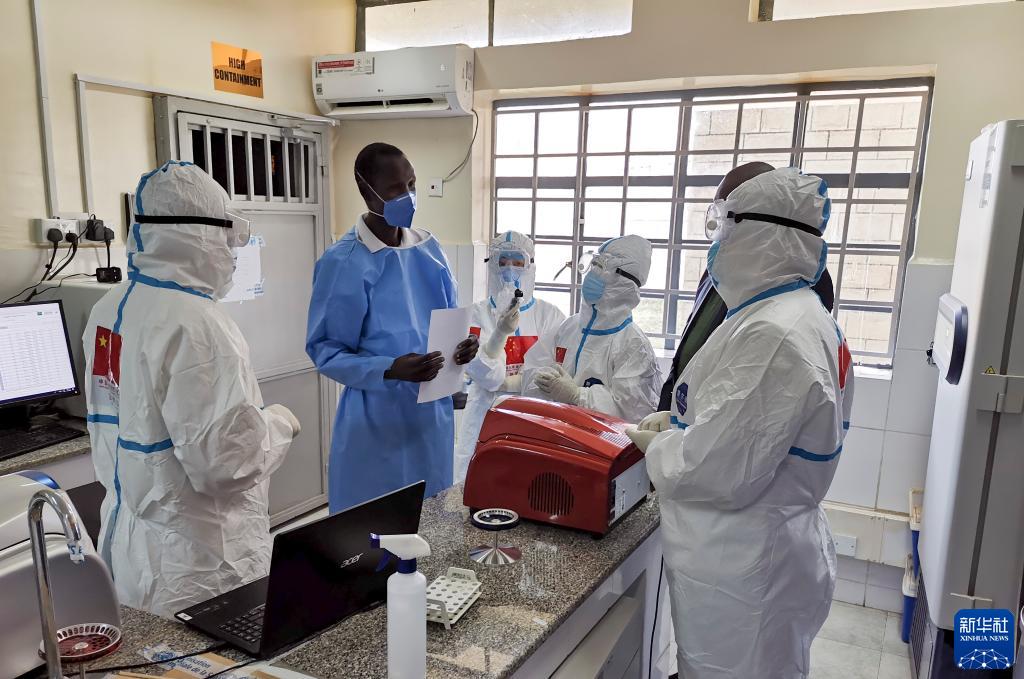 在南蘇丹首都朱巴的一處新冠病毒檢測機構,中國抗疫醫療專家組成員與南一線醫護人員交流(2020年8月21日攝)。新華社發(中國駐南蘇丹大使館供圖)