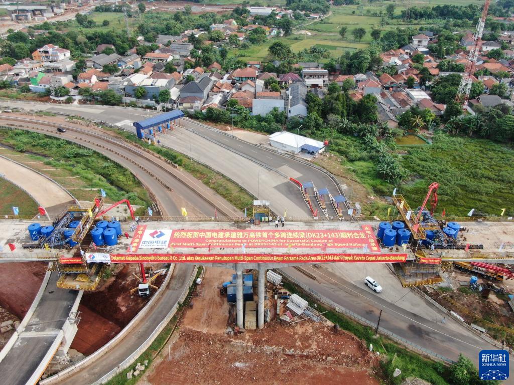 這是2020年5月10日拍攝的印度尼西亞雅萬高鐵首個多跨連續梁合龍現場。雅萬高鐵項目是中國高鐵全系統、全要素、全生產鏈走出國門的“第一單”,也是“一帶一路”倡議的標志性工程和印尼國家戰略項目。新華社記者 杜宇 攝