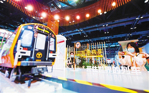觀眾在2021年中國國際服務貿易交易會智慧交通服務展位“開往世界的列車”前拍照。服貿會是全球服務貿易領域規模最大、內容最豐富的國際展會,也是我國促進高水平對外開放的重要平臺。