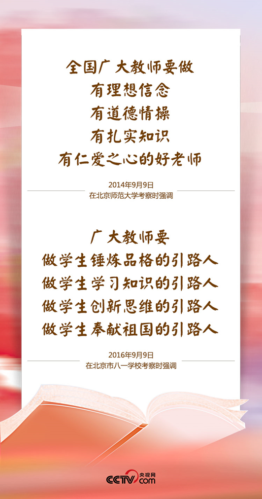 他看了不少優秀教師的事跡,“很多事跡感人至深、催人淚下”。吉林大學教授黃大年“心有大我、至誠報國”、河北農業大學教授李保國把畢生精力投入到山區生態建設和科技富民事業之中……總書記為他們點贊,要求在廣大教師中、在全社會大力宣傳和弘揚優秀教師的先進事跡和高尚品德。