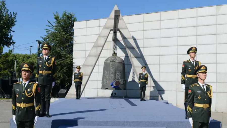 參觀者經過沈陽九一八歷史博物館內的《義勇軍進行曲》浮雕墻。新華社記者李鋼攝