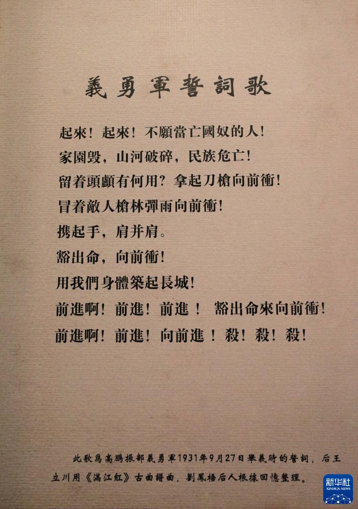 在東北抗日義勇軍紀念館拍攝的《義勇軍誓詞歌》歌詞(7月21日攝)。新華社記者 蔡湘鑫 攝