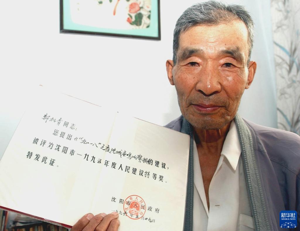 沈陽市民郝松青在展示自己“9月18日鳴響警報的建議”獲得當年人民建議特等獎證書(2005年9月13日攝)。新華社發