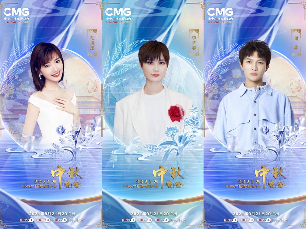 同預告片一起公開的,還有今年秋晚的全部嘉賓陣容,在發布的幾組海報中,除去豐富的演出陣容外,海報主題與細節元素也格外吸睛。海報共分“清風朗月”、“花好月圓”與“浮光月影”三個版本。“清風朗月”版海報以藍紫色調為背景,毛曉彤、李宇春、周深等嘉賓在海報中央被一個象征中秋團圓的圓環所包裹,圓環中若隱若現的古代建筑與海報下方的池水元素與晚會舉辦地相結合,清新中又具內涵,仿若一股清風撲面而來。