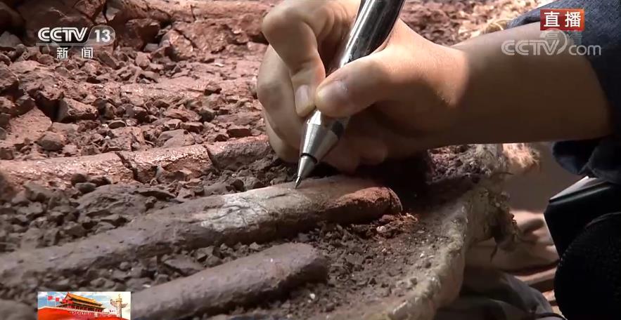 先來關注2號科考現場。在昨天(10月4日)的工作中,恐龍化石的尾椎部分已經逐漸顯露出來,我們也通過專家的介紹,了解了恐龍尾巴的作用。今天現場工作進入了“啃硬骨頭”階段,會有什么樣有趣的發現呢,馬上來連線總臺央視記者趙曙光。