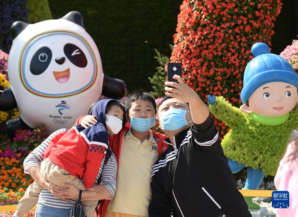 10月1日,人們在北京長安街西單路口“喜迎冬奧”主題花壇前拍照留影。