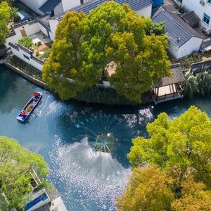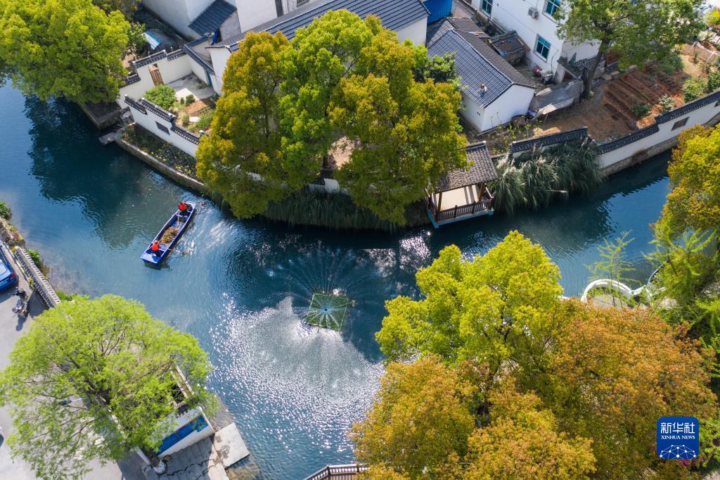 在浙江省長興縣龍山街道渚山村,保潔人員進行日常河道護理巡查(2020年4月9日攝,無人機照片)。新華社記者 徐昱 攝