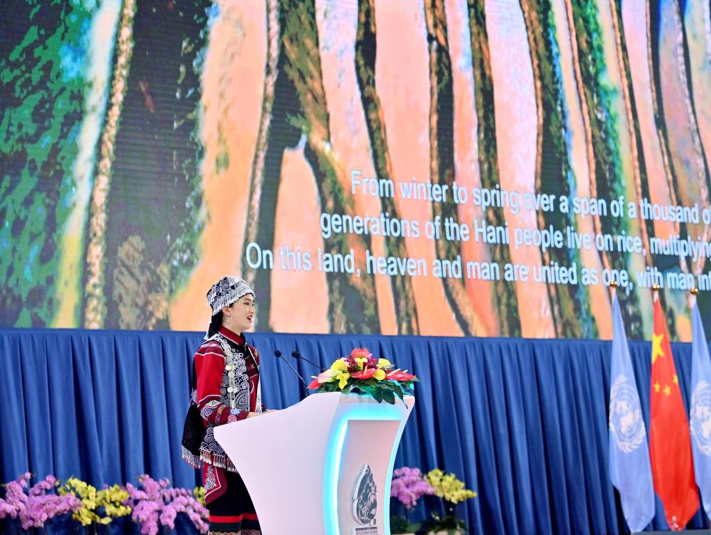 波光粼粼的梯田,農人辛勤地耕作,鴨子在水里歡快地游……大屏幕播放著云南紅河哈尼梯田的視頻,身著民族服飾的中國少數民族青年代表施曉悅講述了那里人與自然和諧共生的故事。