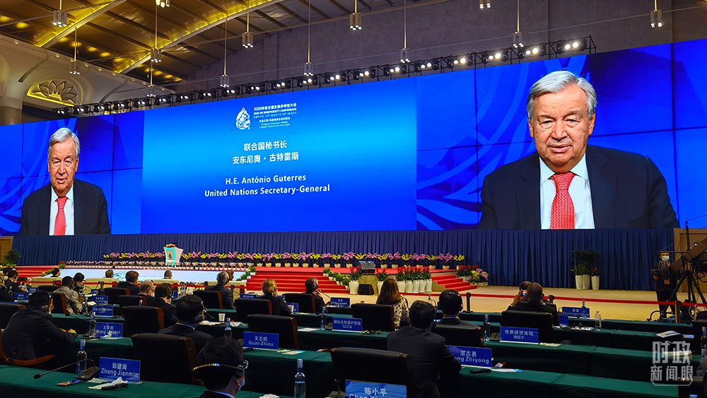 △聯合國秘書長古特雷斯通過視頻方式致辭。(總臺央視記者舒貝拍攝)