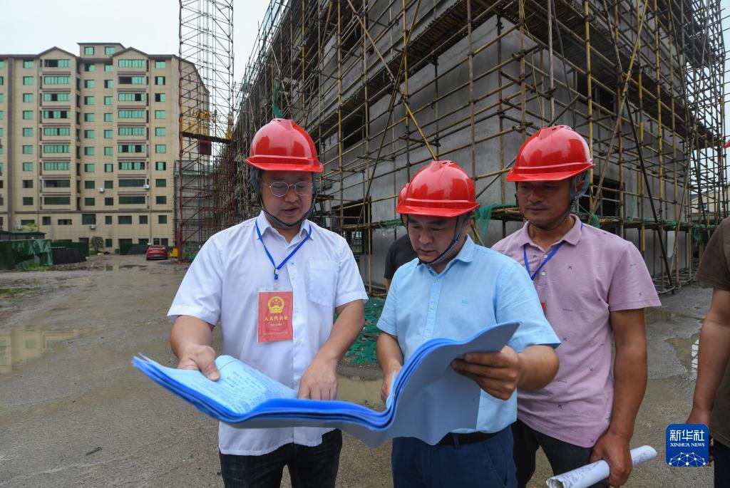 2021年6月2日,在浙江省湖州市吳興區(qū)東林鎮(zhèn)星火村,當(dāng)?shù)厝舜蟠淼揉l(xiāng)村議事會(huì)成員對(duì)星火村農(nóng)民新村建設(shè)項(xiàng)目的施工進(jìn)展情況進(jìn)行監(jiān)督檢查。新華社記者 徐昱 攝
