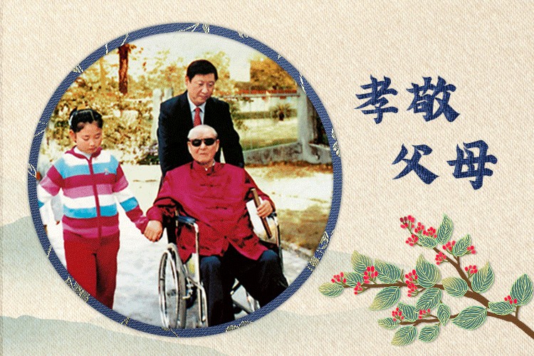 習近平孝敬父母,盡管公務繁忙,每當有時間他都會拉著母親的手散步、聊天,春節不能和父母團聚,會用電話訴說愧疚、表達孝心。他的書架上擺著兩張照片:一張是他與家人陪坐在輪椅上的父親散步,另一張是他牽著母親的手在院子里漫步。孝親、敬老,體現在細微之處。