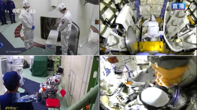 3名航天員陸續通過飛船軌道艙進入返回艙。